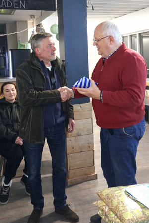 Na een kleine toespraak van onze voorzitter reikte Lex een cadeaubon en een prachtige boeket bloemen uit aan Walter en met een forse handdruk bedankt hij hem voor de fijne samenwerking.