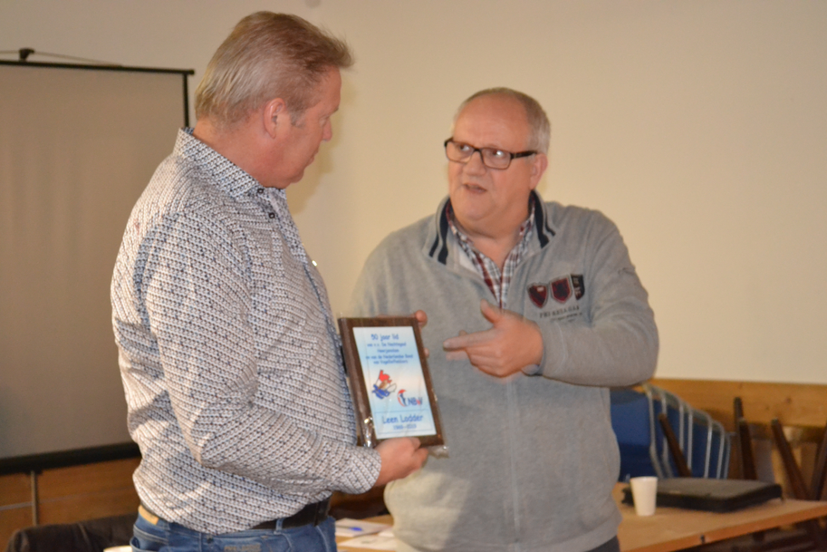 Leen Lodder is 50 jaar lid van v.v. De Nachtegaal Heerjansdam en van de N.B.v.V. Hiervoor heeft hij tijdens de ledenbijeenkomst, op 28 februari 2019, een aandenken en een bos bloemen van de verenging en het speldje van de N.B.v.V. in ontvangst mogen nemen. Dit alles werd uitgereikt door Lex Kaptein, voorzitter.