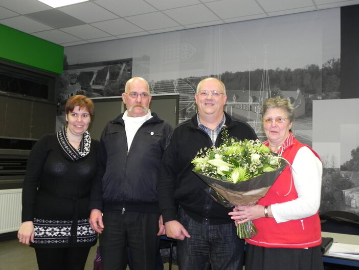 Op 1 januari jl was Teun v/d Waal 25 jaar lid van Vogelvereniging de Nachtegaal. Hiervoor heeft hij tijdens de jaarvergadering, op 26 januari 2012, het speldje van v.v. De Nachtegaal ontvangen. Het speldje werd uitgereikt door onze Voorzitter, Lex Kaptein. En het prachtige boeket bloemen werd, door penningmeester Tjerd Kamphuis, uitgereikt aan Suzan v/d Waal, echtgenote van Teun. Na deze huldiging werd er door de aanwezige leden een borrel op gedronken.