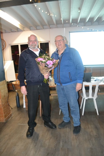 Teun van der Waal is 50 jaar lid van de N.B.v.V. Op 30 januari 2025 heeft Teun het speldje N.B.v.V. in ontvangst mogen nemen. De speld en de daarbij horende bosbloemen werden uitgereikt door Lex Kaptein, voorzitter v.v. De nachtegaal Heerjansdam/Zwijndrecht.
